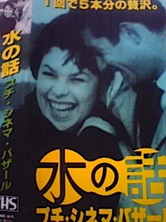 大通りのラルズの近辺の人達は、又始まったと思う年に何度かある中古ビ・デ・オ市。まだみんながビデオとDVDの両方を持っている頃は1本\300だったのが、今はもう皆さんビデオにさよならしちゃって、今は初日から1本¥100なんです。後半になると、2本で¥100に!!時代は代わりましたね。私はまだ両方派なので物色してたらお宝発見!短編映画が5本入ったもので、「水の話」監督フランソワ・トリュフォー&ジャン=リュック・ゴダール 本当にパリの郊外で洪水になったのを利用して映画を撮りに行った作品。それを映画にしたいが為に5本の短編集にしたもの。その中にはクレイ映画で有名な監督ヤン・シュワンクマイエルの「闇・光・闇」もありました。それぞれ全く関連性があるとは思えない不思議な映画ばかりで、映画の好みがチョットずれてる私にはかなりお宝の1本で「ラルズありがとう」でした。 |